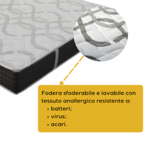 - Igiene garantita: la fodera lavabile e sfoderabile permette di mantenere il materasso sempre pulito e fresco, proteggendolo da acari, batteri e allergeni.