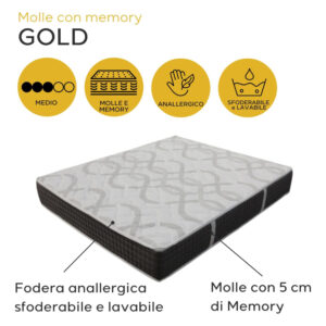 - Fodera anallergica e lavabile: il materasso Gold è rivestito con un tessuto anallergico, resistente a batteri, virus e acari, che contribuisce a mantenere un ambiente di riposo sano e sicuro. La fodera è sfoderabile e lavabile, rendendo semplice la manutenzione e garantendo un’igiene costante nel tempo.