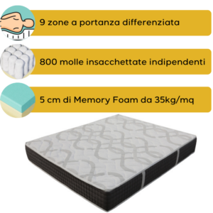 - 800 molle insacchettate indipendenti: la struttura del materasso è composta da 800 molle insacchettate indipendenti, che si adattano perfettamente ai movimenti del corpo, offrendo un supporto personalizzato. Le 9 zone di portanza differenziata assicurano il massimo sostegno in ogni parte del corpo, riducendo i punti di pressione e favorendo una postura corretta durante il sonno.