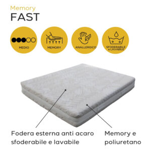 - Fodera esterna sfoderabile e lavabile: il materasso Fast è dotato di una fodera esterna antiacaro, completamente sfoderabile, che può essere facilmente lavata per mantenere un livello elevato di igiene. Perfetto per chi è attento alla salute e desidera un materasso sempre pulito e fresco.