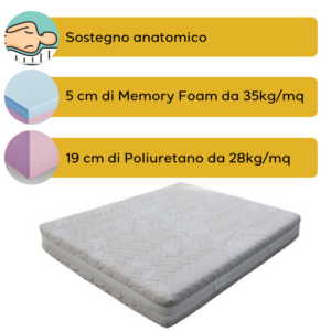 - Supporto anatomico: grazie allo strato di Memory Foam, il materasso offre un sostegno anatomico che si adatta alla conformazione del corpo, riducendo la pressione sulle articolazioni e migliorando la qualità del sonno.