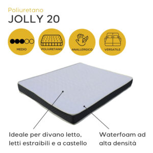 - Materiale Waterfoam ad alta densità: il Jolly 20 è costruito con una lastra interna in Waterfoam da 25 kg/mq, un materiale altamente resistente che assicura sostegno ottimale per ogni tipo di corporatura. La flessibilità del Waterfoam consente al materasso di adattarsi facilmente a diverse configurazioni di letto, mantenendo nel tempo la sua consistenza e forma.
