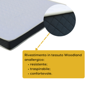 - Rivestimento in tessuto Woodland anallergico: il materasso è rivestito in un tessuto Woodland trapuntato in fibra anallergica, che favorisce la traspirabilità e aggiunge uno strato extra di comfort. Il tessuto è resistente, piacevole al tatto e facile da pulire.